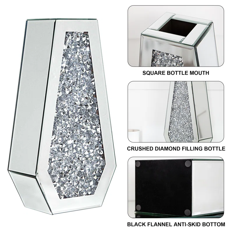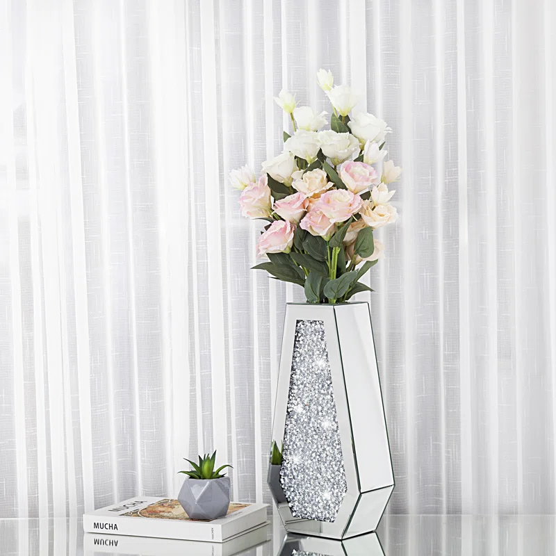 Vases serve as versatile accents for tables and shelves, offering a perfect spot for your favorite artificial flowers or eye-catching embellishments. Thoughtful trinkets like this mirrored diamond vase bring warmth to your living space, effortlessly complementing any interior design. Whether filled with flowers, dried arrangements, or branches, this versatile piece can be a stunning centerpiece or a striking mantel accent, offering endless style options. Ideal for mantels, formal dining areas, wedding tables, and more, mirror glass vases are a popular choice for DIY event planners seeking sophistication in bulk orders.